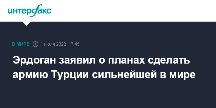 Москва. 1 июля. INTERFAX.RU - Президент Турции Реджеп Тайип Эрдоган заявил, что собирается продолжать укреплять армию страны до тех пор, пока она не станет сильнейшей в мире, сообщает агентство "Анадолу".