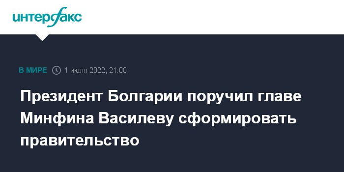 Москва. 1 июля. INTERFAX.RU - Президент Болгарии Румен Радев передал министру финансов Асену Василеву мандат на формирование нового правительства после того, как парламент выразил недоверие премьеру Кирилу Петкову, сообщает агентство Associated Press.