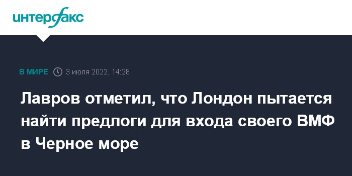 Москва. 3 июля. INTERFAX.RU - Лондон пытается найти предлоги и создать условия для того, чтобы королевский военно-морской флот внедрился в Черное море для последующего руководства освобождением зерна из Украины, заявил глава МИД РФ Сергей Лавров.