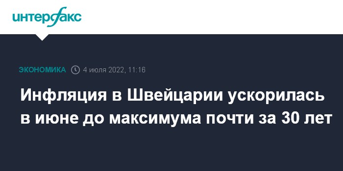 Москва. 4 июля. INTERFAX.RU - Темпы роста потребительских цен в Швейцарии в июне усилились до 3,4% в годовом выражении с 2,9% в мае, инфляция обновила максимум с 1993 года, свидетельствуют официальные данные.