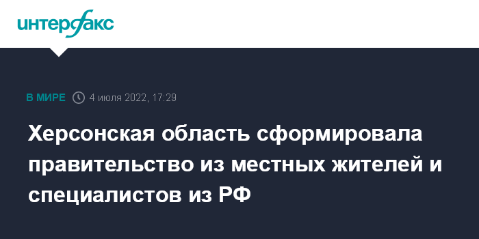 Москва. 4 июля. INTERFAX.RU - Постоянное правительство сформировано в Херсонской области из местных жителей и российских специалистов, сообщила временная администрация региона в понедельник.