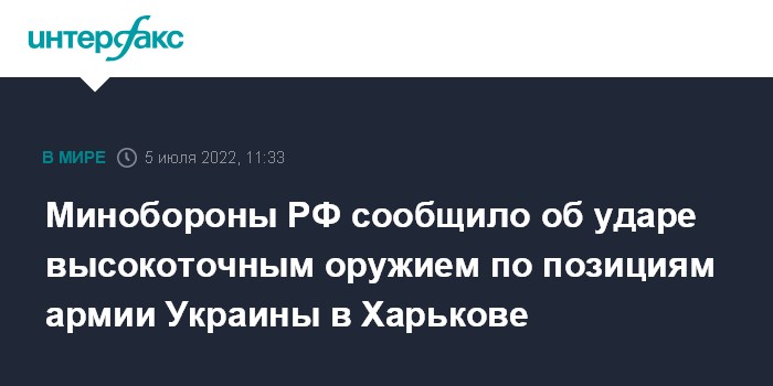 Москва. 5 июля. INTERFAX.RU - Российские военные сообщили об ударе высокоточным оружием по позициям армии Украины в Харькове, уничтожено до 150 военных и 12 единиц техники.