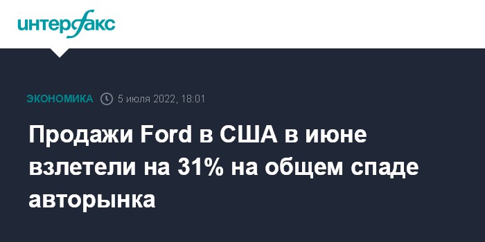 Москва. 5 июля. INTERFAX.RU - В июне 2022 года продажи автомобилей Ford Motor в США подскочили на 31,5% в годовом исчислении и достигли 152 262 машин, говорится в пресс-релизе компании.
