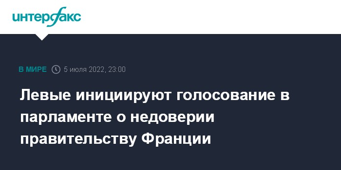 Москва. 5 июля. INTERFAX.RU - Блок французских левых и "зеленых" Nupes поставит в среду в Национальном собрании вопрос о недоверии правительству Элизабет Борн, сообщила газета Le Figaro.