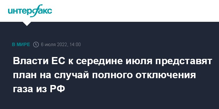 Москва. 6 июля. INTERFAX.RU - Евросоюз должен готовиться к потенциальному полному отключению поставок российского газа, заявила председатель Еврокомиссии (ЕК) Урсула фон дер Ляйен.