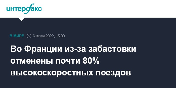 Москва. 6 июля. INTERFAX.RU - Во Франции из-за забастовки железнодорожников 6 июля парализовано движение поездов. В управляющей железными дорогами компании SNCF сообщили, что пришлось отменить почти 80% высокоскоростных экспрессов. Движение транспорта нарушено, в частности, в Парижском регионе.
