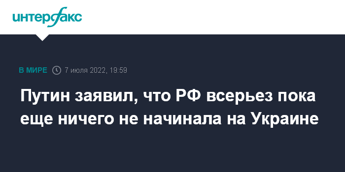 Москва. 7 июля. INTERFAX.RU - Россия пока не предпринимала серьезных действий в ходе спецоперации на Украине и не отказывается от мирных переговоров, заявил президент РФ Владимир Путин.