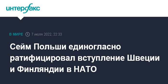 Москва. 7 июля. INTERFAX.RU - Сейм Польши (нижняя палата парламента) в четверг единогласно одобрил присоединение Финляндии и Швеции к НАТО, сообщил представитель польского Агентства внутренней безопасности Станислав Жарын.