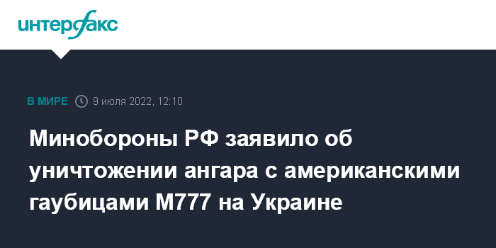 Москва. 9 июля. INTERFAX.RU - Российские воздушно-космические силы уничтожили на Украине ангар с американскими гаубицами, заявили в Минобороны РФ.
