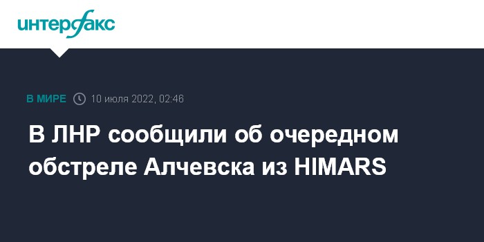 Москва. 10 июля. INTERFAX.RU - Вооруженные силы Украины в воскресенье ночью обстреляли подконтрольный ЛНР город Алчевск с применением реактивных систем залпового огня (РСЗО) американского производства "HIMARS", сообщает представительство республики в Совместном центре по контролю и координации режима прекращения огня (СЦКК).