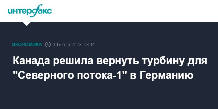 Москва. 10 июля. INTERFAX.RU - Канада согласилась отправить в Германию принадлежащую "Газпрому" газовую турбину производства компании Siemens для трубопровода "Северный поток-1", которая находилась на ремонте в Монреале, сообщил канадский министр природных ресурсов Джонатан Уилкинсон.