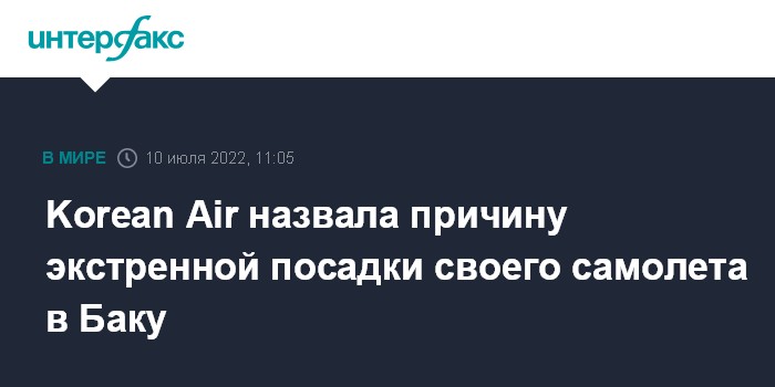 Москва. 10 июля. INTERFAX.RU - Южнокорейская авиакомпания Korean Air в воскресенье сообщила, что причиной экстренной посадки в Баку ее самолета, летевшего из Турции, стала неисправность в одном из двигателей. Об этом пишет агентство Yonhap.