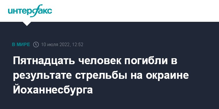 Москва. 10 июля. INTERFAX.RU - Пятнадцать человек, по уточненным данным, стали жертвами стрельбы в тауншипе Соуэто на окраине Йоханнесбурга, сообщает агентство Associated Press в воскресенье.