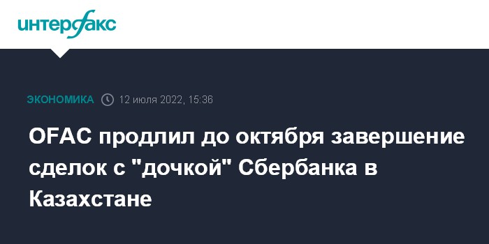 Москва. 12 июля. INTERFAX.RU - Дочерний банк российского Сбербанка в Казахстане будет работать без ограничений до 11 октября 2022 года, так как управление по контролю над иностранными активами Минфина США (OFAC) продлило срок завершения сделок с ним еще на три месяца.