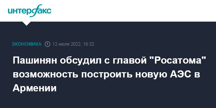 Москва. 12 июля. INTERFAX.RU - Премьер-министр Армении Никол Пашинян и гендиректор госпоркорпации "Росатом" Алексей Лихачев обсудили в Ереване дальнейшую эксплуатацию второго энергоблока Армянской АЭС и возможности построиь новую атомную электростанцию в Армении. Об этом сообщила пресс-служба Пашиняна.