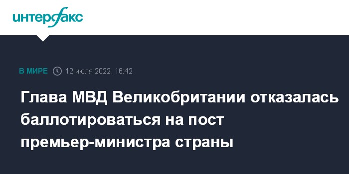 Москва. 12 июля. INTERFAX.RU - Министр внутренних дел Великобритании Прити Пател заявила, что не будет принимать участия в выборах главы Консервативной партии и премьера страны, сообщает во вторник Sky News.