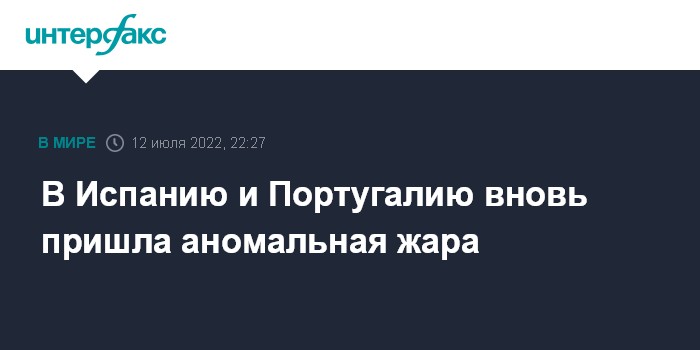 Москва. 12 июля. INTERFAX.RU - В Испании и Португалии фиксируют высокие температуры, до конца недели установится аномальная жара, и метеорологи предупреждают о риске возникновения и распространения лесных пожаров, передает агентство Associated Press.
