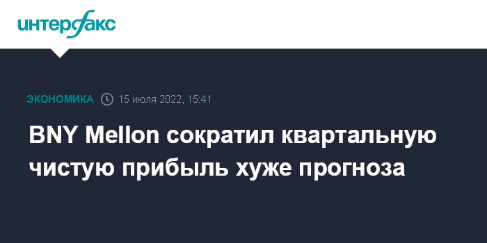 Москва. 15 июля. INTERFAX.RU - Во втором квартале 2022 года Bank of New York Mellon (BNY Mellon), крупнейший в мире банк-кастодиан, снизил чистую прибыль на 16% - до $835 млн по сравнению с $991 млн за тот же период предыдущего года.