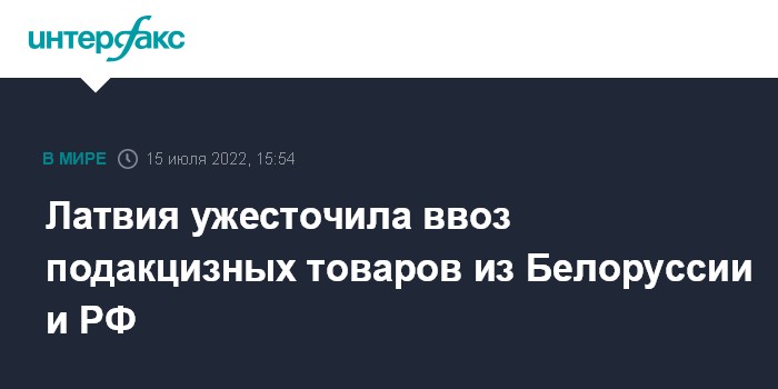 Москва. 15 июля. INTERFAX.RU - Сейм Латвии внес поправки в закон "Об акцизах", направленные на сокращение перемещения физических лиц через границу Белоруссии и России за подакцизными товарами, сообщил Единый портал Латвийского радио и телевидения.