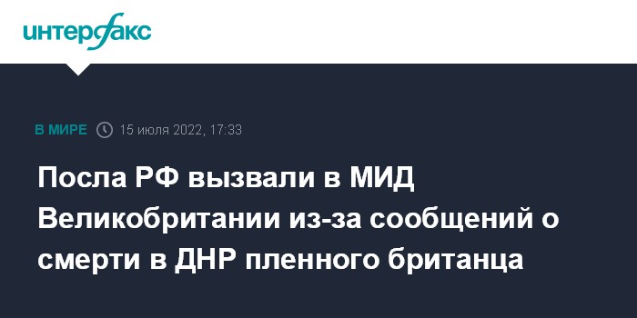 Москва. 15 июля. INTERFAX.RU - Посол России в Великобритании Андрей Келин вызван в пятницу в британский МИД в связи с сообщениями о том, что попавший в плен подданный Великобритании Пол Ури умер в Донецкой народной республике (ДНР), говорится в заявлении британского ведомства.