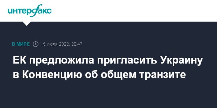 Москва. 15 июля. INTERFAX.RU - Европейская комиссия (ЕК) предложила пригласить Украину присоединиться к Конвенции об общем транзите – международной системе таможенного транзита товаров, которая гарантирует упрощенные процедуры в этой сфере между Евросоюзом и странами-партнерами.