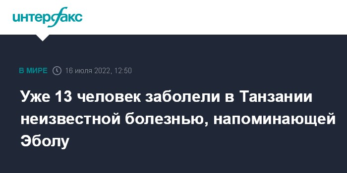 Москва. 16 июля. INTERFAX.RU - Главный санитарный врач Танзании призвал соблюдать спокойствие в связи с распространением в стране неизвестного заболевания, которое зафиксировано у 13 человек. Как сообщает ABC News, три человека умерли от этой болезни.