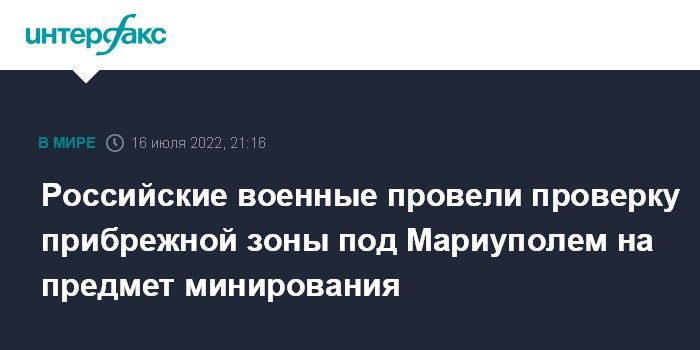 Москва. 16 июля. INTERFAX.RU - Инженерные подразделения Новороссийской военно-морской базы Черноморского флота и инженерного соединения Южного военного округа выполнили проверку более 5 км береговой линии в районе поселка Мелекино под Мариуполем, сообщили "Интерфаксу" в пресс-службе ЮВО.