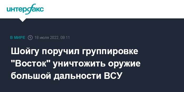 Москва. 18 июля. INTERFAX.RU - Министр обороны РФ Сергей Шойгу посетил задействованную в ходе спецоперации на Украине группировку "Восток", отдал указание ликвидировать ракетные и артиллерийские средства большой дальности армии Украины, из которых ведутся обстрелы Донбасса, сообщили в Минобороны России в понедельник.