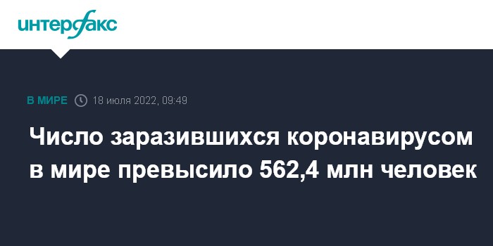 Москва. 18 июля. INTERFAX.RU - Число зарегистрированных случаев заражения коронавирусом в мире на утро понедельника достигло 562 443 449, свидетельствуют данные американского университета Джонса Хопкинса.