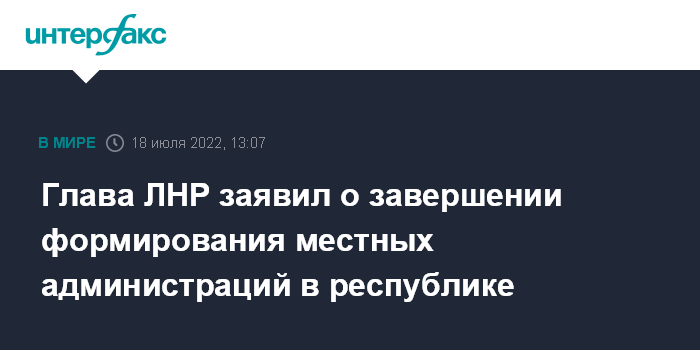 Москва. 18 июля. INTERFAX.RU - Власти Луганской народной республики сформировали местные администрации во всех населенных пунктах ЛНР, перешедших под контроль Народной милиции в рамках наступательной операции, сообщил глава республики Леонид Пасечник.