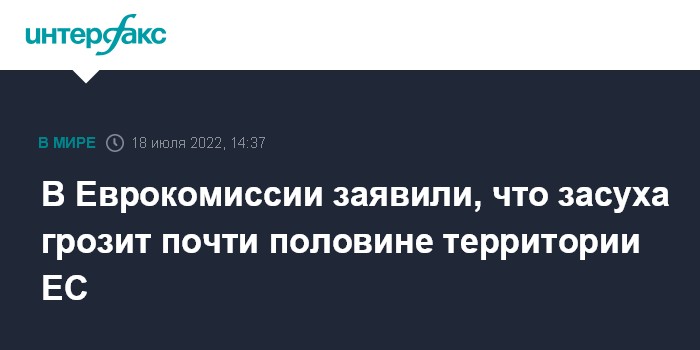 Москва. 18 июля. INTERFAX.RU - Анализ развития и воздействия продолжительной жары в ЕС показывает, что 46% территории союза подвержено риску засухи и 11% уже переживает дефицит почвенной влаги, сообщила в понедельник Еврокомиссия (ЕК).