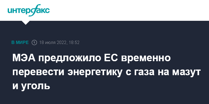 Москва. 18 июля. INTERFAX.RU - Международное энергетическое агентство (МЭА) предложило пять мер для преодоления газового кризиса, которые позволят европейским странам безопасно пережить грядущую зиму на фоне сокращения поставок топлива из РФ.