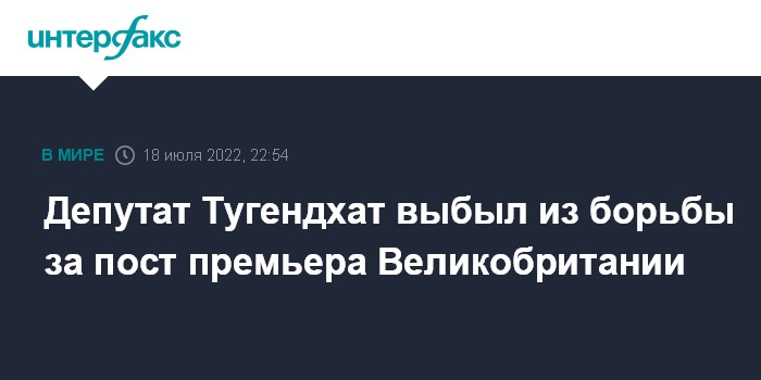 Москва. 18 июля. INTERFAX.RU - Председатель спецкомитета по иностранным делам Палаты общин британского парламента Том Тугендхат по итогам третьего тура выборов нового лидера Консервативной партии Великобритании покидает электоральную гонку и выбывает из борьбы за пост премьера страны.