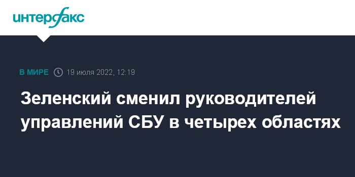 Москва. 19 июля. INTERFAX.RU - Президент Украины Владимир Зеленский сменил руководителей управлений Службы безопасности Украины в Сумской, Полтавской, Закарпатской и Днепропетровской областях, уволил руководителя Житомирского облуправления спецслужбы и назначил главу Харьковского облуправления СБУ.