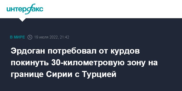 Москва. 19 июля. INTERFAX.RU - Президент Турции Реджеп Тайип Эрдоган заявил на саммите "астанинской тройки" в Тегеране, что курдские формирования должны покинуть 30-километровую зону в Сирии у границы с Турцией.