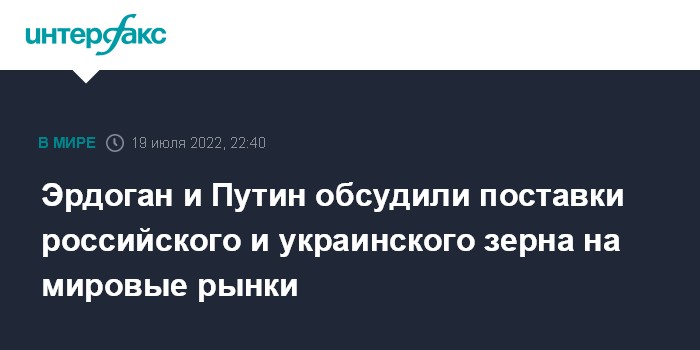 Москва. 19 июля. INTERFAX.RU - Главы РФ и Турции на встрече во вторник в Тегеране обсудили вопросы продовольственной безопасности и поставки зерна из России и Украины на мировые рынки, сообщил президент РФ Владимир Путин.