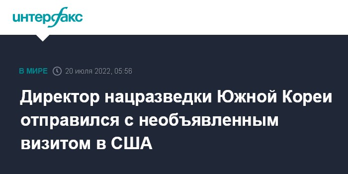 Москва. 20 июля. INTERFAX.RU - Директор Национальной разведывательной службы Южной Кореи (NIS) Ким Гю Хен совершил необъявленный визит в США на фоне опасений по поводу возможности проведения Северной Кореей ядерного испытания или других провокационных действий, сообщает "Ренхап".