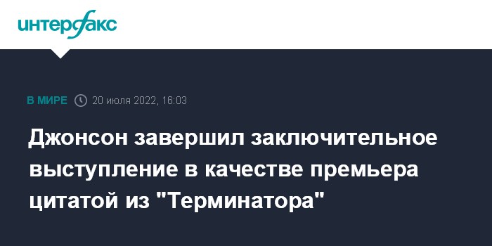 Москва. 20 июля. INTERFAX.RU - Уходящий в отставку премьер-министр Великобритании Борис Джонсон завершил свое последнее выступление в парламенте крылатой фразой "Hasta la vista, baby" из фильма "Терминатор 2: Судный день", сообщает в среду Sky News.