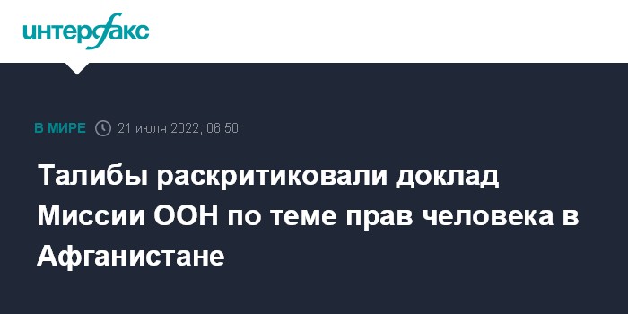 Москва. 21 июля. INTERFAX.RU - Движение "Талибан" ("Талибан" - запрещенная в РФ террористическая организация) назвало доклад Миссии ООН по содействию Афганистану (МООНСА) по правам человека в Афганистане "пропагандой".