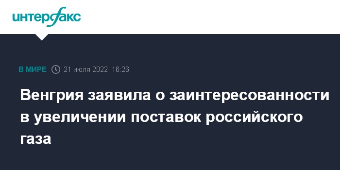 Москва. 21 июля. INTERFAX.RU - Венгрия заинтересована в увеличении поставок газа из России и в обеспечении своей энергобезопасности в ближайшие месяцы, заявил глава МИД этой страны Петер Сийярто.