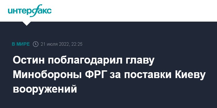 Москва. 21 июля. INTERFAX.RU - Шеф Пентагона Ллойд Остин провел с главой Минобороны ФРГ Кристианой Ламбрехт переговоры о ситуации на Украине, а также выразил благодарность Берлину за поставки Киеву артиллерийских систем.