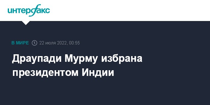 Москва. 22 июля. INTERFAX.RU - Кандидат от правящего в Индии Национального демократического альянса Драупади Мурму победила на выборах президента страны, сообщает газета Indian Express.