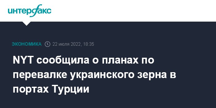 Москва. 22 июля. INTERFAX.RU - Соглашение о вывозе украинского зерна из портов Одессы, Черноморска и Южного предусматривает доставку грузов по безопасным маршрутам в порты Турции, где будет осуществляться их перевалка, раскрылва The New York Times детали документа.