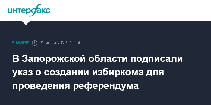 Москва. 23 июля. INTERFAX.RU - Подписан указ о создании избирательной комиссии Запорожской области для проведения референдума о вхождении в состав России, сообщил глава временной администрации Запорожской области Евгений Балицкий.
