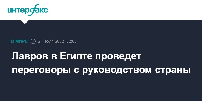Москва. 24 июля. INTERFAX.RU - Глава МИД РФ Сергей Лавров в ходе рабочего визита в Египет проведет переговоры с руководством страны.