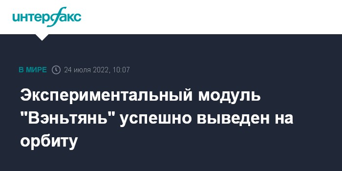 Москва. 24 июля. INTERFAX.RU - Экспериментальный модуль "Вэньтянь" благополучно выведен на орбиту и теперь направляется к национальной орбитальной станции Китая "Тяньгун", чтобы войти в состав ее орбитальной группировки, трансляцию запуска ведет Центральное телевидение Китая (CCTV).