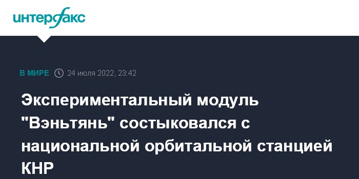 Москва. 24 июля. INTERFAX.RU - Экспериментальный модуль "Вэнтянь" успешно пристыковался к переднему порту базового модуля "Тяньхэ" национальной орбитальной станции Китая "Тяньгун", сообщило в воскресенье Управление программы пилотируемых полетов КНР (CMSA).