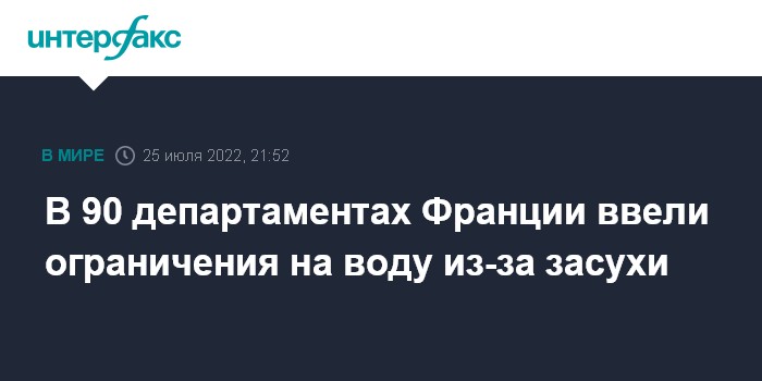 Москва. 25 июля. INTERFAX.RU - Во Франции за последние сутки прибавилось еще два департамента, в которых по причине продолжающейся засухи введены ограничения на использование воды, и теперь их количество достигло 90 из 96 департаментов европейской части страны.