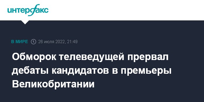 Москва. 26 июля. INTERFAX.RU - Вторые дебаты между кандидатами на пост лидера консерваторов и, следовательно, премьер-министра Великобритании - главой МИД Лиз Трасс и бывшим министром финансов Риши Сунаком прервались, потому что телеведущая Кейт Маккэнн упала в обморок.