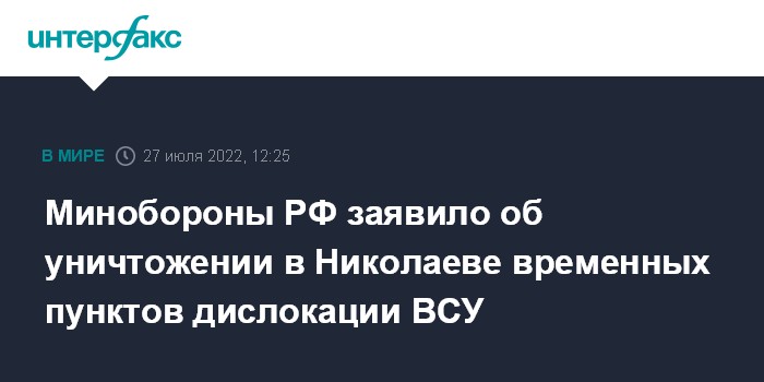 Москва. 27 июля. INTERFAX.RU - Летчики российских Воздушно-космических сил (ВКС) уничтожили в Николаеве временные пункты дислокации двух бригад Вооруженных сил Украины, сообщил официальный представитель министерства обороны РФ Игорь Конашенков на брифинге в среду.